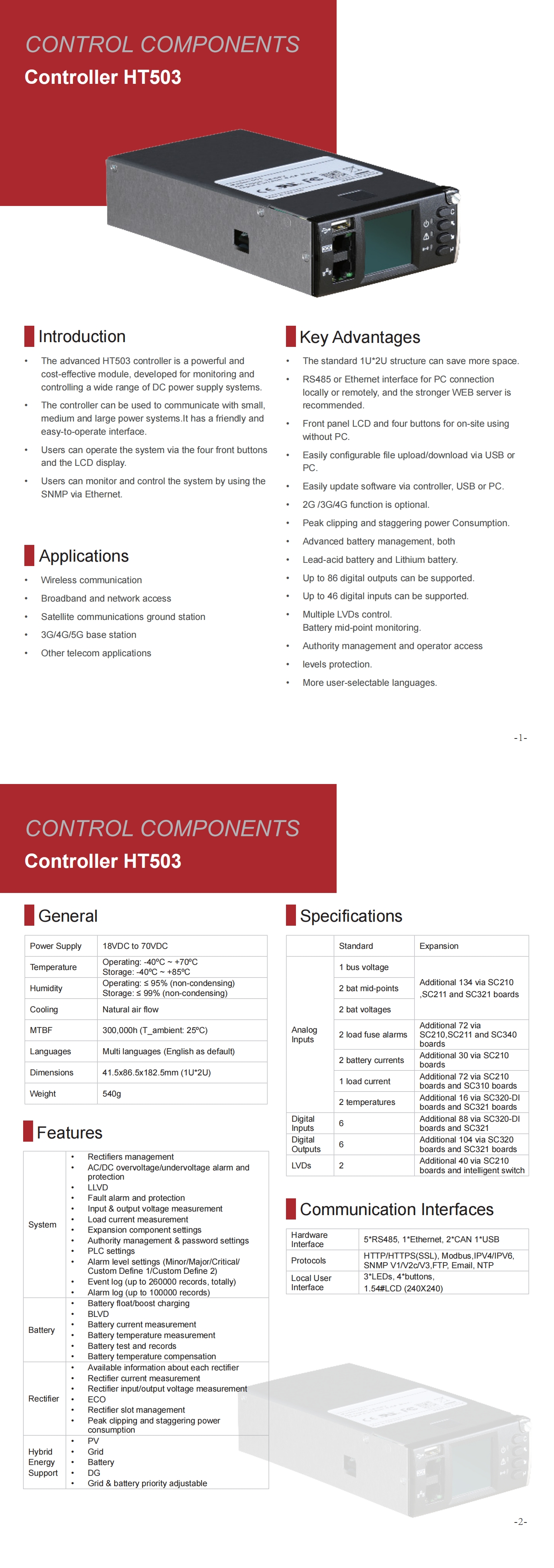 • Усовершенствованный управляющий модуль HT505 - мощный и экономичный модуль, разработанный для мониторинга и контроля различных систем электропитания постоянным током.